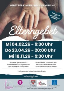Herzliche Einladung zum nächsten Elterngebet am Donnerstag, 23.04.2026 um 20:00 Uhr im evang. Gemeindehaus. Gemeinsam beten wir zu Gott für unsere Kinder und Jugendliche. Wir sind Eltern, Großeltern und Menschen, die mit Kinder und Jugendlichen arbeiten.
