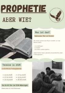 Bereits zum dritten mal fand kurz vor Weihnachten die prophetische Gruppe, die von Kerstin und Markus Kugel sowie Sophie Schwenkedel und Svenja Weber geleitet wird, statt. Neben Lehrinhalten bildet das praktische einüben das Herzstück dieser Abende. Da die einzelnen Lehreinheiten nicht aufeinander aufbauen ist es möglich jederzeit dazuzukommen. Auch der Besuch an einzelnen Abenden zum “reinschnuppern” ist möglich. Ich beobachte, dass sich überall im Land solche Gruppen bilden und das Interesse an diesem Thema wieder unter Christen zunimmt. Der nächste Abend ist am 27. Februar 2026.